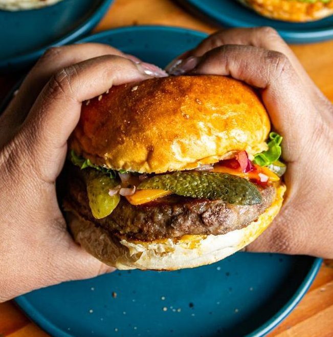 Hamburguesa de vacuno ,pepinillo dill, doble queso cheddar ,lechuga,cubitos de cebolla morada, ketchup y un toque del chef acompañado con papas provenzal y salsas de la casa.
