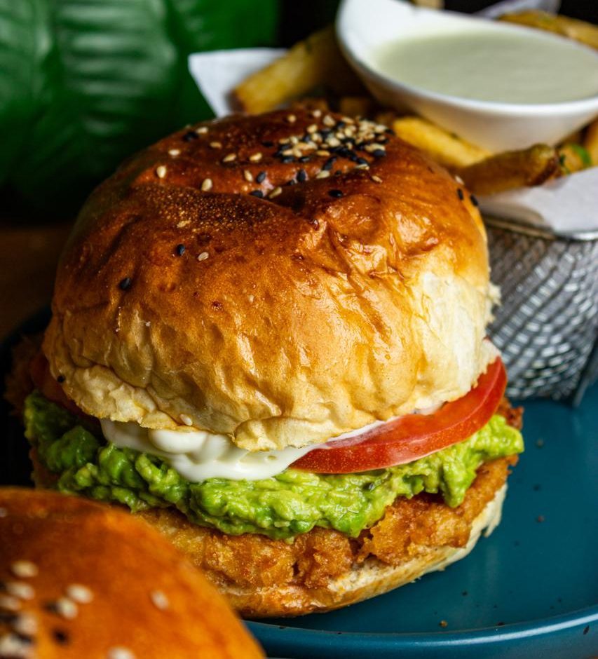 Hamburguesa de Pollo apanado con sal ,limon y pimienta, y los clásicos ingredientes italiano rodajas de tomate , paltas y la mayonesa Hellman classic ,acompañado de papas provenzal y salsa de la casa