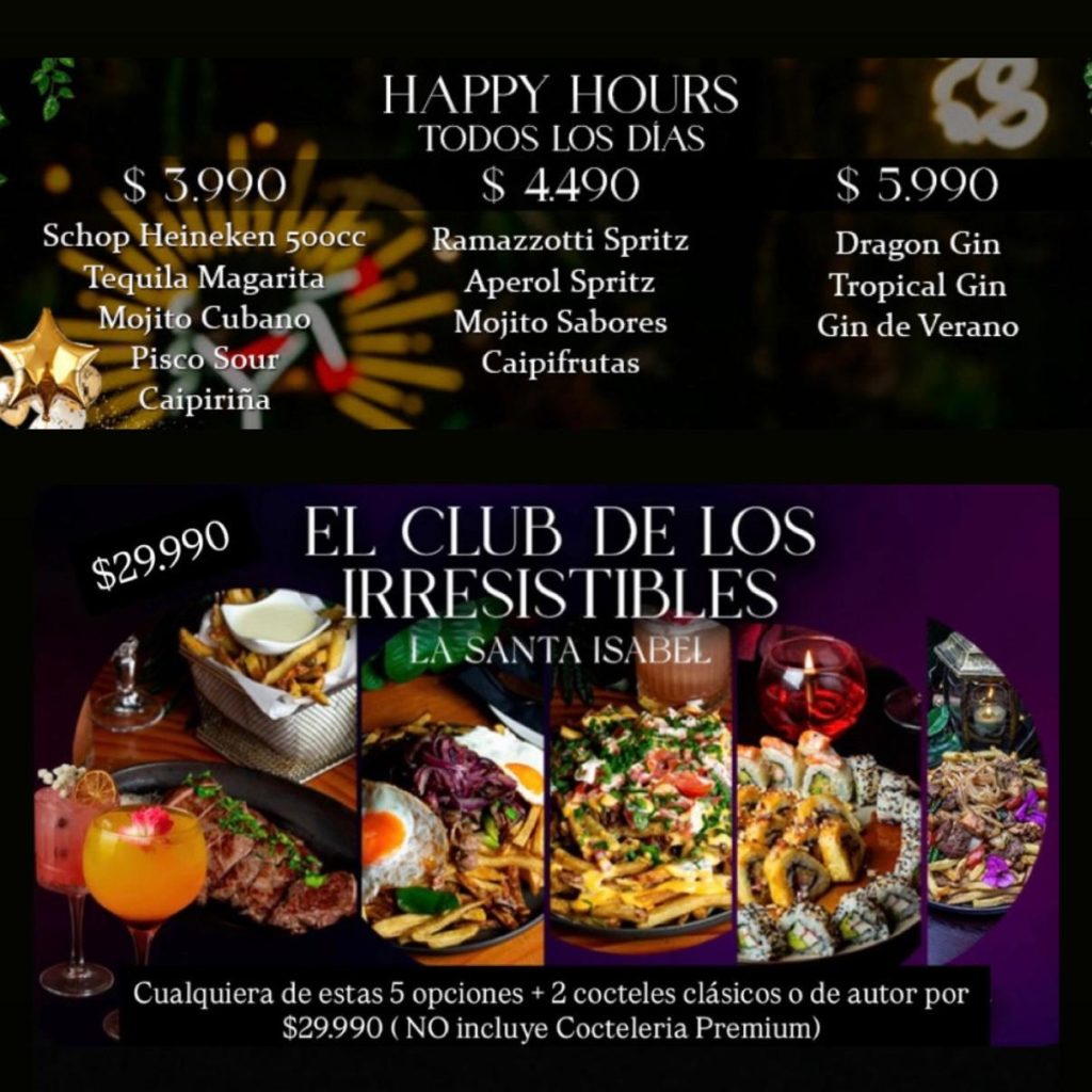 Menú Sucursal Santa Isabel Reservar Happy hour Promociones Disfrutar Para Beber .Coctelería de Autor Premium 🤩 .Cocteleria de autor 🧉 .Schop y Cervezas 🍻 .Sin Pecado cóctel de autor sin alcohol 🍹 Bebidas-jugos-Limonada-Red bull 🍹 Clásicos de Siempre 🍸 Gin Jarras y Jarritas 🍷 Licores (Sin Bebida) Piscos-Ron-Tequila Vinos y Espumante 🍾 vodka Whisky Para Comer -Compartir 🍟 -Crudos-ceviche🦪 -Sushi clásicos 10 Cortes 🍣(Queso Crema Opcional) -Sushi nikkei by Hehin 🍣(10 Cortes) Brochetas - Quesadillas 🍢 Fondos 🥘 Hamburguesas🍔 Postres-Te-cafe 🍰☕️
